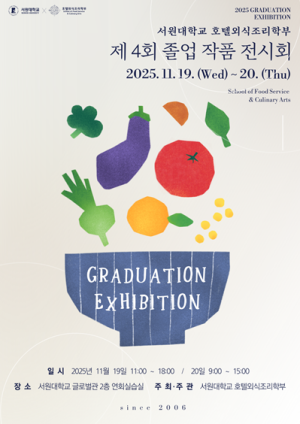 2025학년도 호텔외식조리학부 제4회 졸업작품 전시회11월19일 오전11시부터11월20일 오후3시까지,글로벌관2층201호 연회실습실에서 열린다.학생들이 지난4년간의 배움과 도전을 담아 세계요리·창작요리·특화요리·디저트·식음료 등 전공별 창의성과 전문성이 살아 있는 작품들을 선보이는 자리이다.호텔외식조리학 전공 학부장인 이용철 학부장은 졸업생들이 첫 발을 내딛는 이 뜻깊은 순간에 따뜻한 격려와 응원을 보내주시기 바란다고 밝혔다.창작요리와 특화요리 등을 맛본 참가자들은 미래의 요리전도사로 활동하게될 졸업생들에게 격려와 박수를 보낸다고 말했다.이번 행사에는 졸업생들의 학부모와 관련 전공 교수님, 졸업생, 지역인사 등 150여명이 참여하였다.